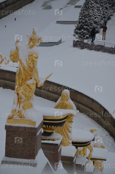 Золотые статуи Большого фонтанного каскада в Нижнем парке Петергофа в Санкт-Петербурге зимой