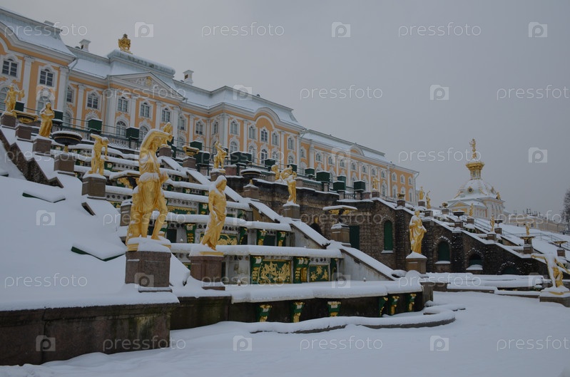 Большой дворец и Большой фонтанный каскад в Нижнем парке Петергофа в Санкт-Петербурге зимой