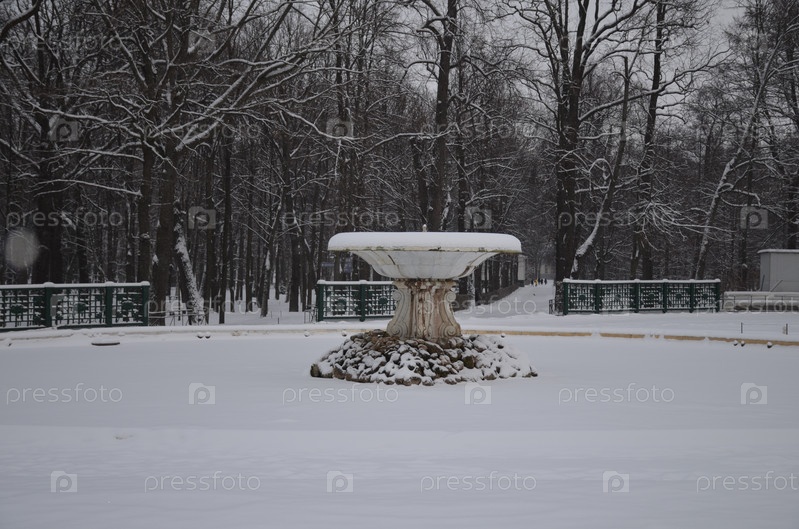 Мраморная чаша фонтана, занесенного снегом в Нижнем парке Петергофа в Санкт-Петербурге зимой