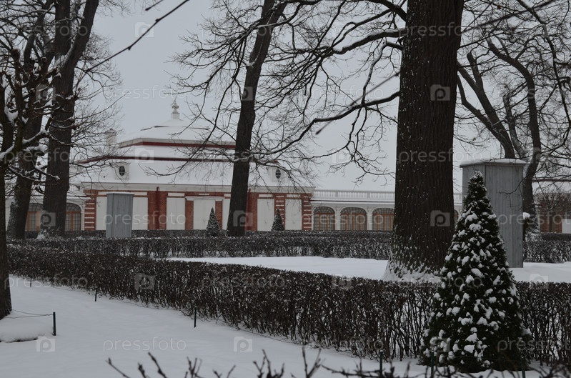 Дворец Монплезир в Нижнем парке Петергофа в Санкт-Петербурге зимой, статуи укрыты на зиму защитными конструкциями