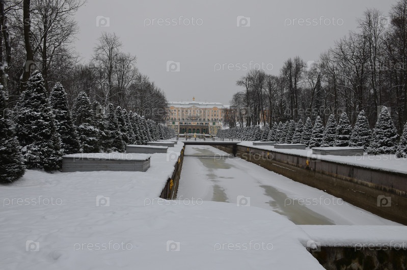 Морской канал, Большой дворец Большой фонтанный каскад в Нижнем парке Петергофа в Санкт-Петербурге зимой