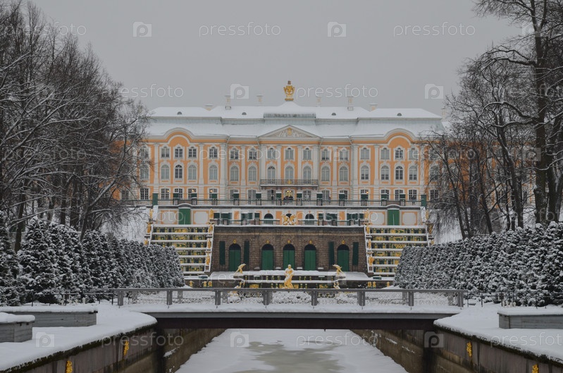 Большой дворец и Большой фонтанный каскад в Нижнем парке Петергофа в Санкт-Петербурге зимой