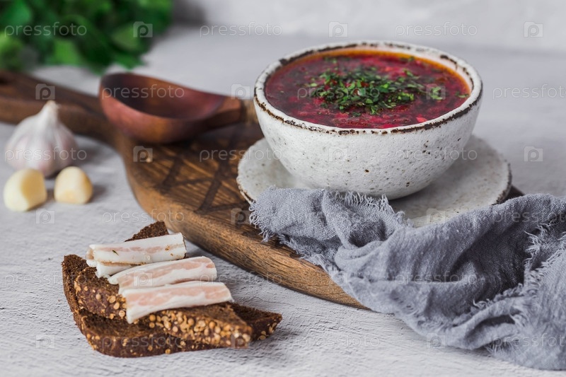 Понятие вкусной еды. Традиционный украинский, русский борщ в стильной керамической тарелке с зеленью, сметаной и чесноком. Свекольный борщ с петрушкой, кориандром и беконом с черным хлебом