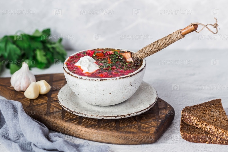 Понятие вкусной еды. Традиционный украинский, русский борщ в стильной керамической тарелке с зеленью, сметаной и чесноком. Свекольный борщ с петрушкой, кориандром и беконом с черным хлебом