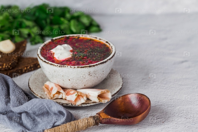 Понятие вкусной еды. Традиционный украинский, русский борщ в стильной керамической тарелке с зеленью, сметаной и чесноком. Свекольный борщ с петрушкой, кориандром и беконом с черным хлебом