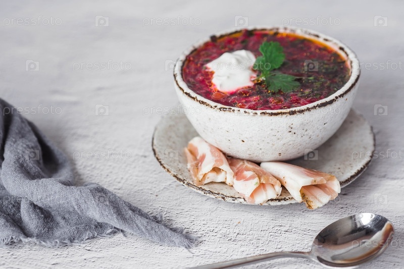 Понятие вкусной еды. Традиционный украинский, русский борщ в стильной керамической тарелке с зеленью, сметаной и чесноком. Свекольный борщ с петрушкой, кориандром и беконом с черным хлебом