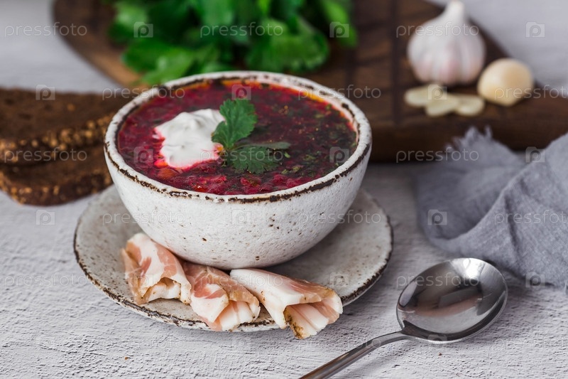 Понятие вкусной еды. Традиционный украинский, русский борщ в стильной керамической тарелке с зеленью, сметаной и чесноком. Свекольный борщ с петрушкой, кориандром и беконом с черным хлебом