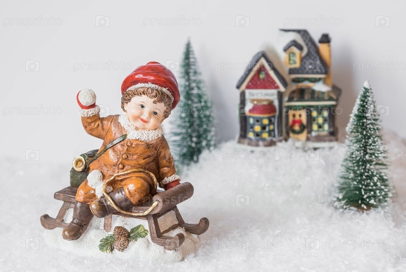 Ретро-рождественская открытка с милой фигуркой ребенка на деревянных санях на красивом заснеженном фоне. Мальчик Б играет в снежки. Концепция зимнего праздника Нового 2024 года