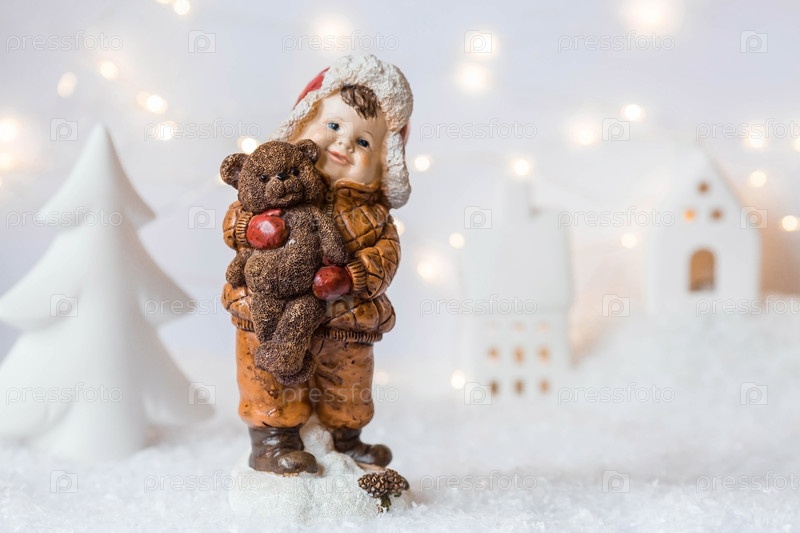 Рождественская открытка в стиле ретро с милой фигуркой ребенка на красивом заснеженном фоне. Мальчик в шапке-ушанке обнимает медвежонка. Концепция зимнего праздника Нового 2024 года