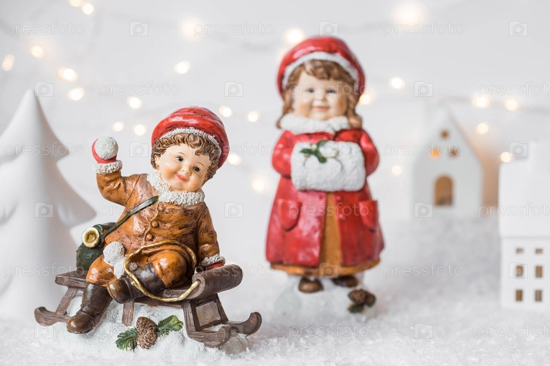 Ретро-рождественская открытка с милыми фигурками детей на деревянных санях на заснеженном фоне. Красивое боке. Концепция зимнего праздника Нового 2024 года