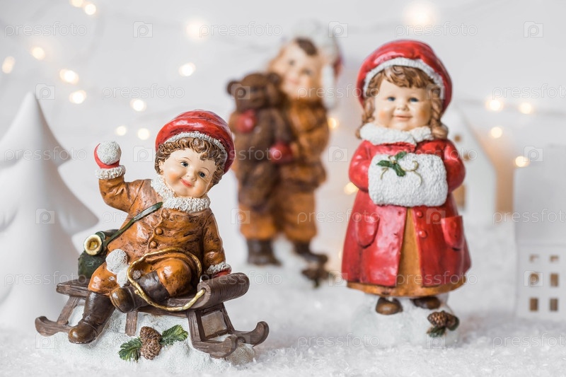 Ретро-рождественская открытка с милыми фигурками детей на деревянных санях на заснеженном фоне. Красивое боке. Концепция зимнего праздника Нового 2024 года