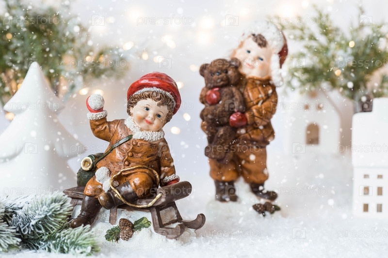 Ретро-рождественская открытка с милыми фигурками детей на деревянных санях на заснеженном фоне. Красивое боке. Концепция зимнего праздника Нового 2024 года