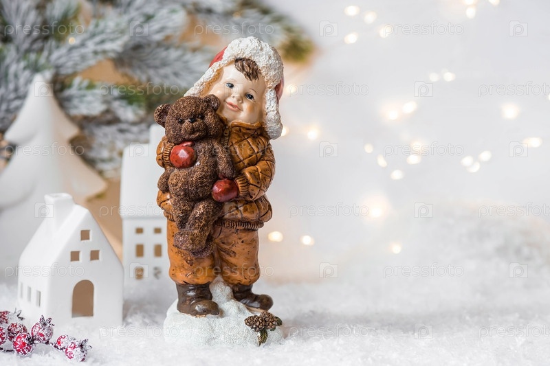 Рождественская открытка в стиле ретро с милой фигуркой ребенка на красивом заснеженном фоне. Мальчик в шапке-ушанке обнимает медвежонка. Концепция зимнего праздника Нового 2024 года