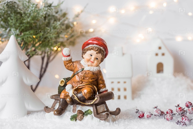 Ретро-рождественская открытка с милой фигуркой ребенка на деревянных санях на красивом заснеженном фоне. Мальчик Б играет в снежки. Концепция зимнего праздника Нового 2024 года
