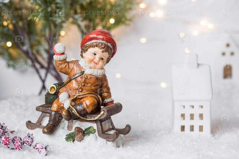 Ретро-рождественская открытка с милой фигуркой ребенка на деревянных санях на красивом заснеженном фоне. Мальчик Б играет в снежки. Концепция зимнего праздника Нового 2024 года
