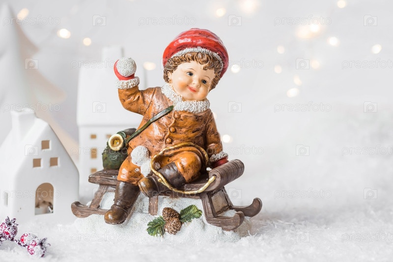 Ретро-рождественская открытка с милой фигуркой ребенка на деревянных санях на красивом заснеженном фоне. Мальчик Б играет в снежки. Концепция зимнего праздника Нового 2024 года
