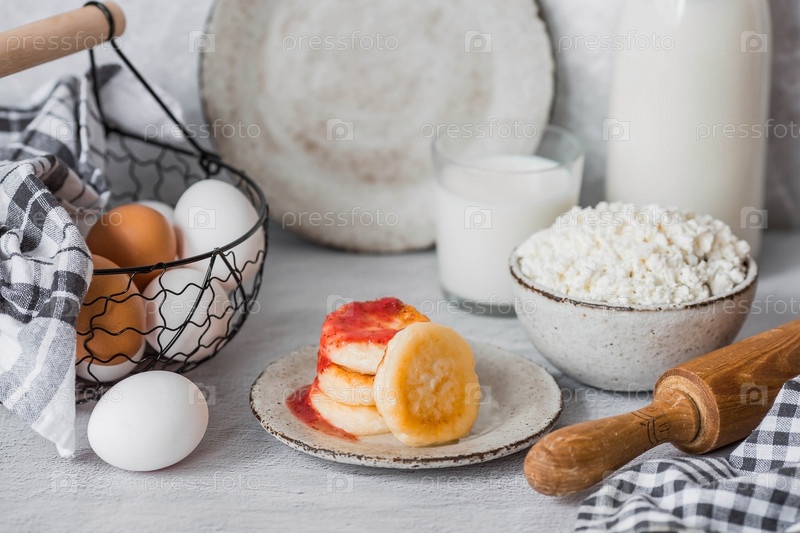 Свежие молочные продукты, молоко, творог, чизкейки, яйца в стильной керамической посуде на сером фоне. Концепция естественного, диетического питания. Полезные продукты