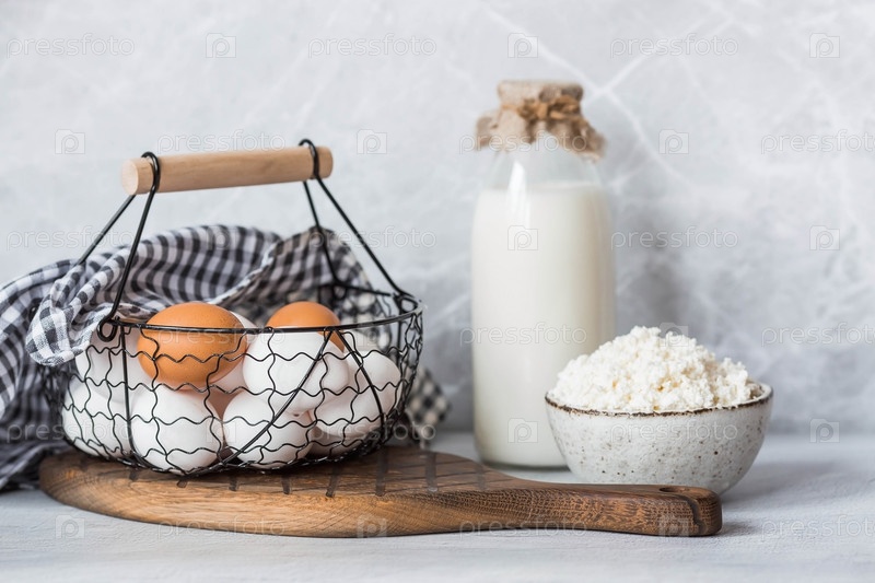 Свежие молочные продукты, молоко, творог, яйца в стильной керамической посуде на сером фоне. Концепция естественного, диетического питания. Полезные продукты