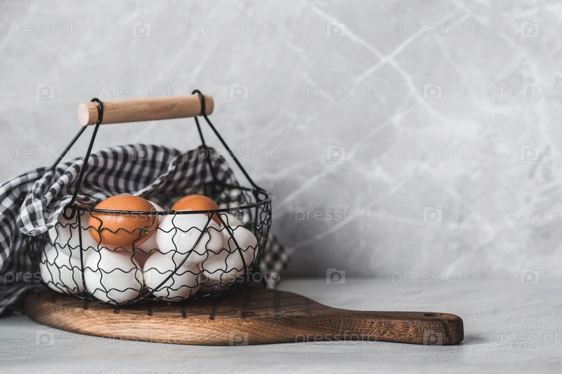 Свежие фермерские яйца в стильной винтажной железной корзине на сером фоне. Концепция естественного, здорового питания. Полезные продукты