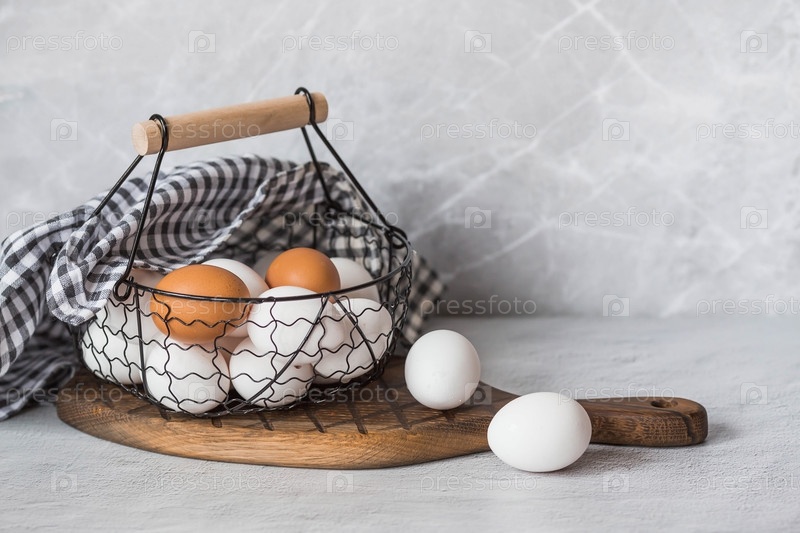 Свежие фермерские яйца в стильной винтажной железной корзине на сером фоне. Концепция естественного, здорового питания. Полезные продукты