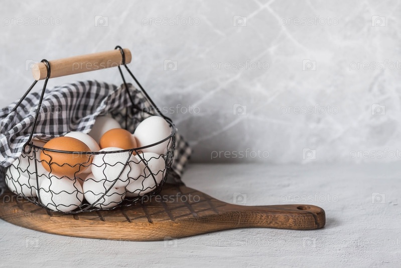 Свежие фермерские яйца в стильной винтажной железной корзине на сером фоне. Концепция естественного, здорового питания. Полезные продукты