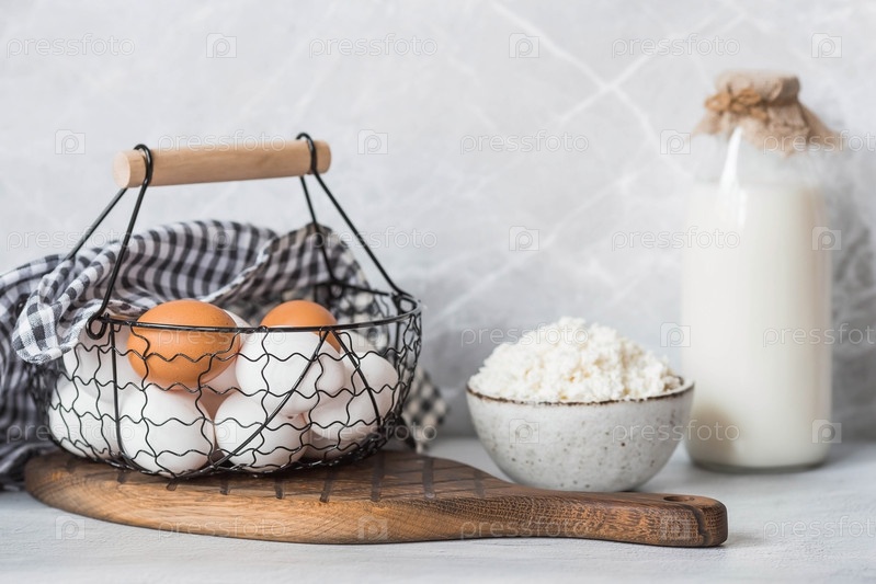 Свежие молочные продукты, молоко, творог, яйца в стильной керамической посуде на сером фоне. Концепция естественного, диетического питания. Полезные продукты