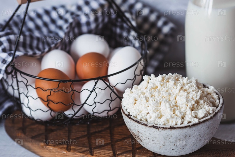 Свежие молочные продукты, молоко, творог, яйца в стильной керамической посуде на сером фоне. Концепция естественного, диетического питания. Полезные продукты