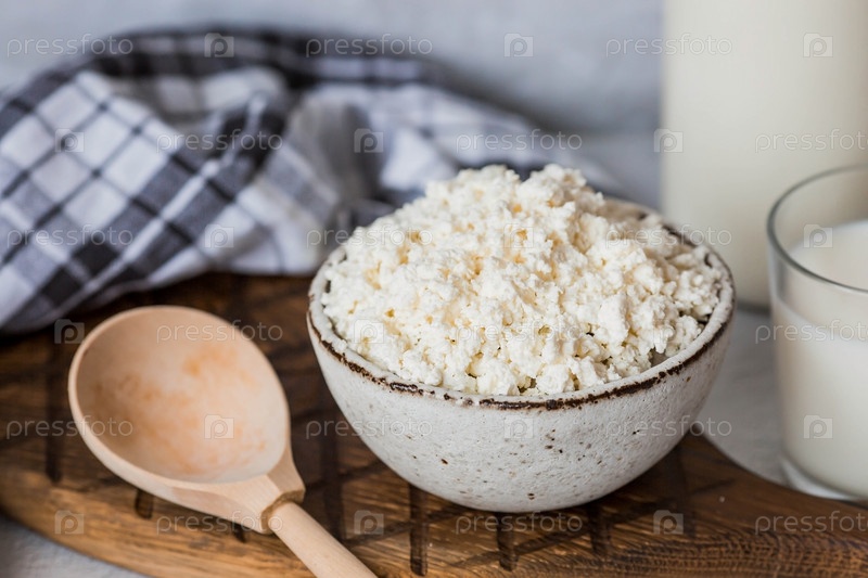 Свежие молочные продукты, молоко, творог, яйца в стильной керамической посуде на сером фоне. Концепция естественного, диетического питания. Полезные продукты