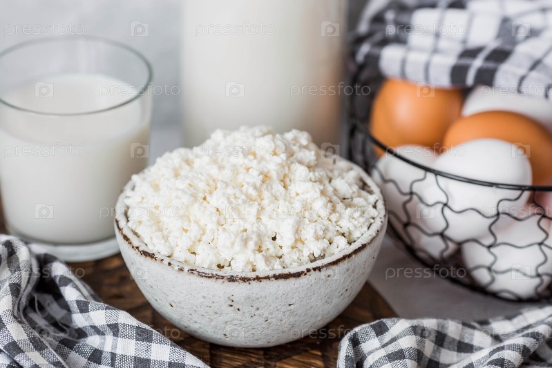 Свежие молочные продукты, молоко, творог, яйца в стильной керамической посуде на сером фоне. Концепция естественного, диетического питания. Полезные продукты