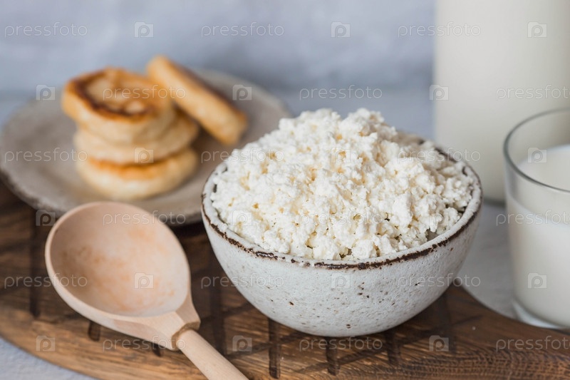 Свежие молочные продукты, молоко, творог, чизкейки, яйца в стильной керамической посуде на сером фоне. Концепция естественного, диетического питания. Полезные продукты