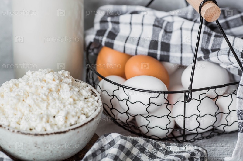 Свежие молочные продукты, молоко, творог, яйца в стильной керамической посуде на сером фоне. Концепция естественного, диетического питания. Полезные продукты