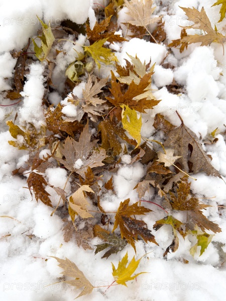 Сухие желтые листья лежат на снегу