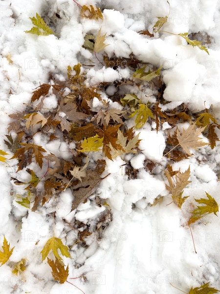 Сухие желтые листья лежат на снегу