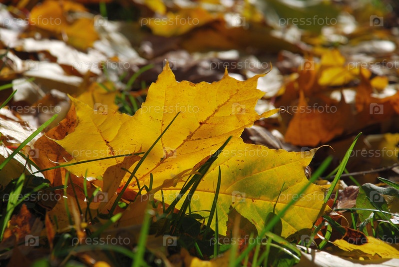 Желтые кленовые листья на зеленой траве