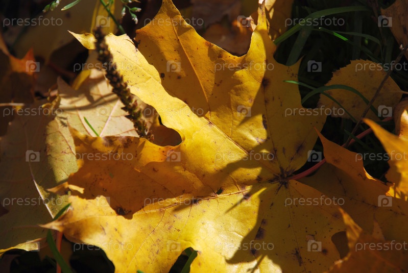 Желтые кленовые листья на зеленой траве. Осенний солнечный день на зеленой низкой траве лежат желтые, коричневые и красные большие листья деревьев. Листья имеют яркие цвета и узнаваемую текстуру