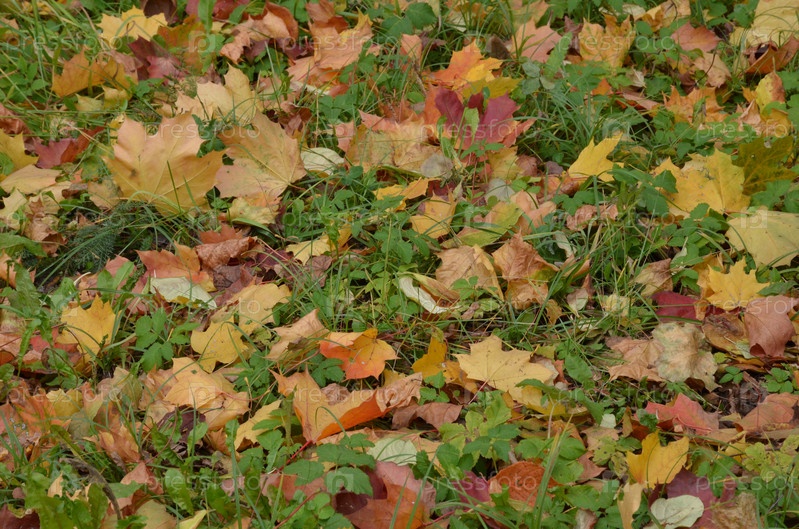 Осенние кленовые листья на зеленом газоне, листопад: фоновое изображение