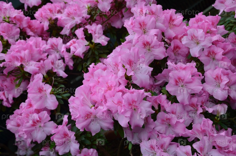 Цветущая розовая азалия (лат. azalea), ярко-зеленые листья, фоновое изображение