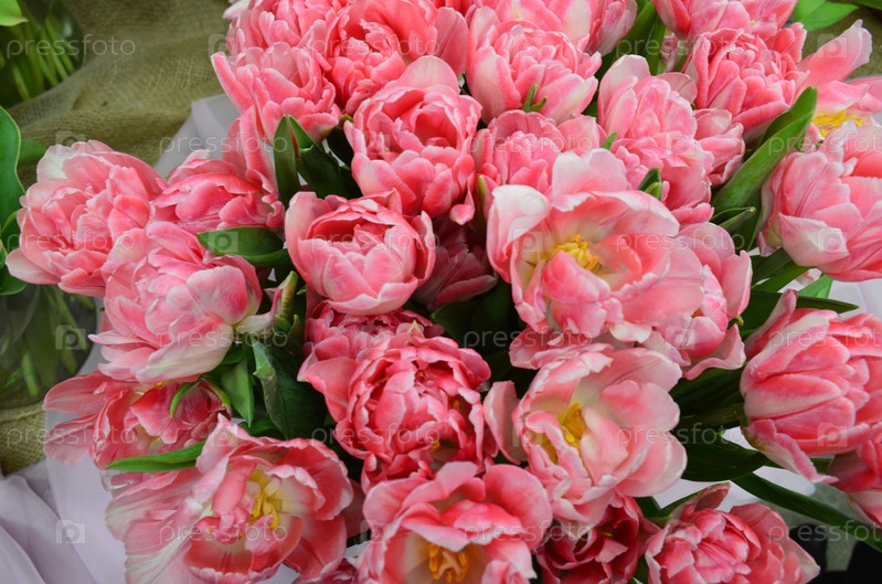 Большое число махровых цветов тюльпанов бело-рохового цвета расположенных близко друг к другу в большом букете: фоновое изображение