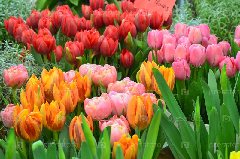 Большое число цветков тюльпанов красного, оранжевого, рощового цвета расположенных близко друг к другу: фоновое изображение
