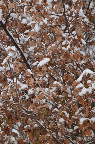 Плотная крона дерева с жухлыми осенними листьями на ветках занесенная снегом: фоновое изображение