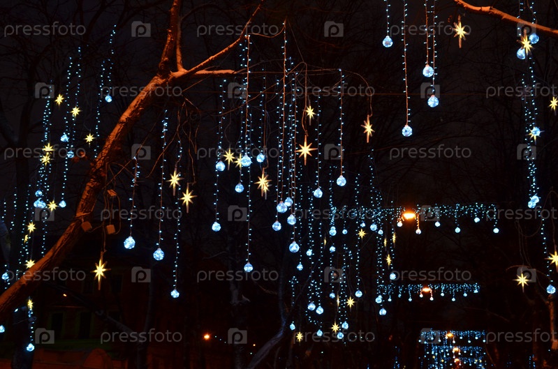 Новогодние украшения Конногвардейского бульвара в Санкт-Петерубрге зимой: гирлянды, шары и звезды на ветвях деревьев