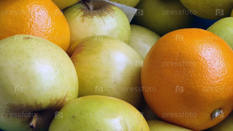 Фрукты лежат рядом друг с другом. Яблоки и апельсины находятся в одном контейнере. Золотисто-зеленые яблоки, оранжевые апельсины. Плоды лежат друг на друге и освещены светом из окна