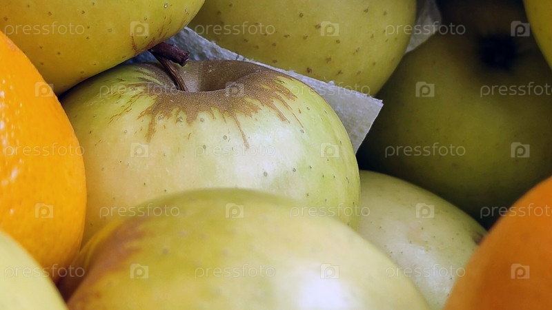 Фрукты лежат рядом друг с другом. Яблоки и апельсины находятся в одном контейнере. Золотисто-зеленые яблоки, оранжевые апельсины. Плоды лежат друг на друге и освещены светом из окна