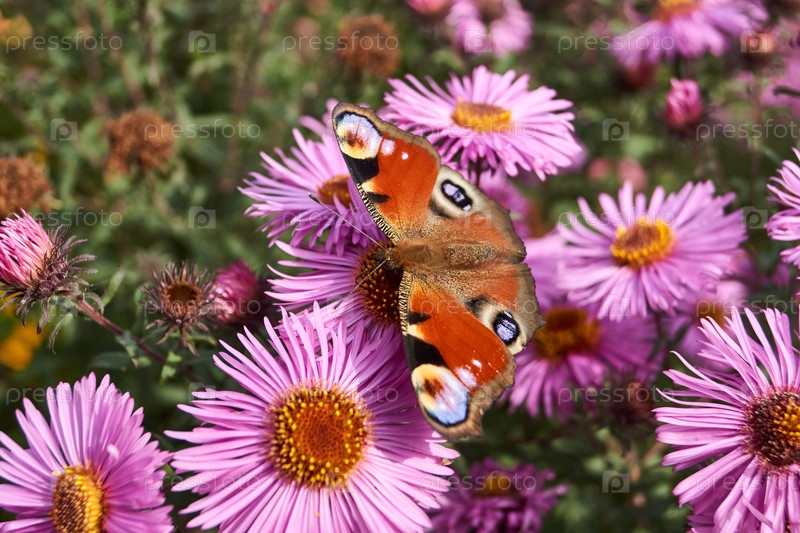 Бабочка 'глаз Павлина' (лат. Aglais io) собирает нектар из цветов