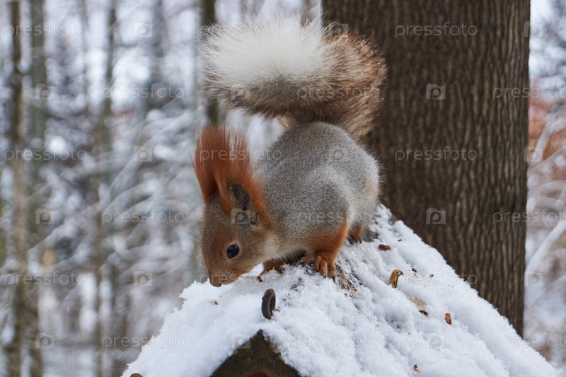 Обезьяна сидит на кормушке и ест орехи.Обезьянки (лат. Sciurus) род грызунов семейства белых