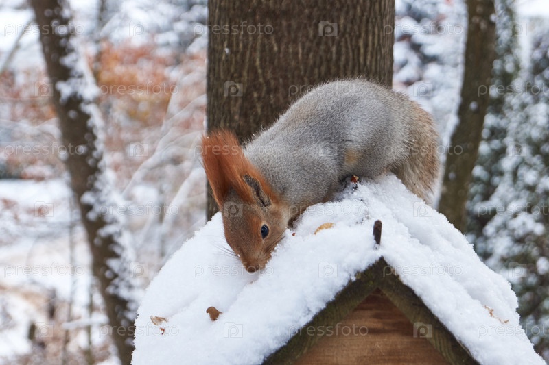 Обезьяна сидит на кормушке и ест орехи.Обезьянки (лат. Sciurus) род грызунов семейства белых