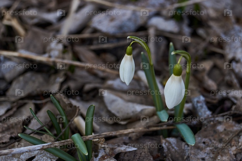 На лужайке в саду цветут подснежники. символ весны. род многолетних трав семейства Амариллидовых (Amaryllidaceae)