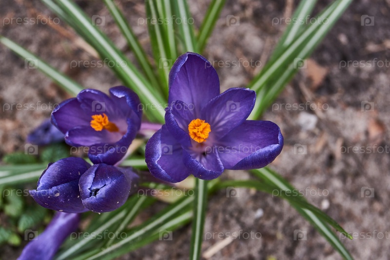 На лужайке в саду цветут крокусы. род многолетних клубневых травянистых растений семейства Иридовые (Iridaceae)