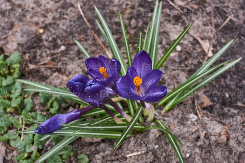 На лужайке в саду цветут крокусы. род многолетних клубневых травянистых растений семейства Иридовые (Iridaceae)