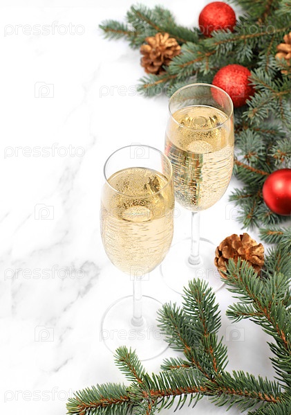 Два бокала шампанского на элегантном праздничном фоне с еловыми ветками и украшениями, концепция сочельника. Рождественский и новогодний макет для дизайна и демонстрации продукции,